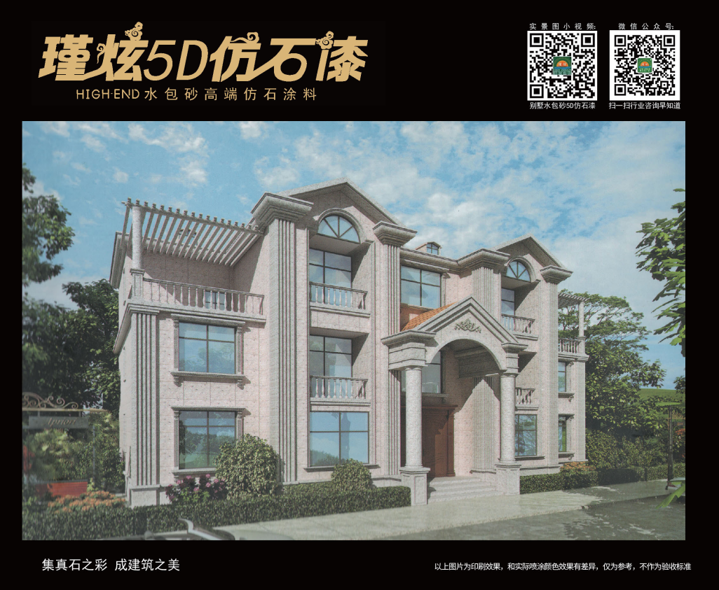 全新别墅外墙仿石漆系列,以天然花岗岩为创意蓝本,纹理色泽简约素雅,突破天然石材的肌理,层次更丰富,并兼具瓷砖耐磨、耐污、易结、安全、环保等综合性能优势,代替天然花岗岩,适用于各种豪华别墅、高档住宅的外墙装饰。