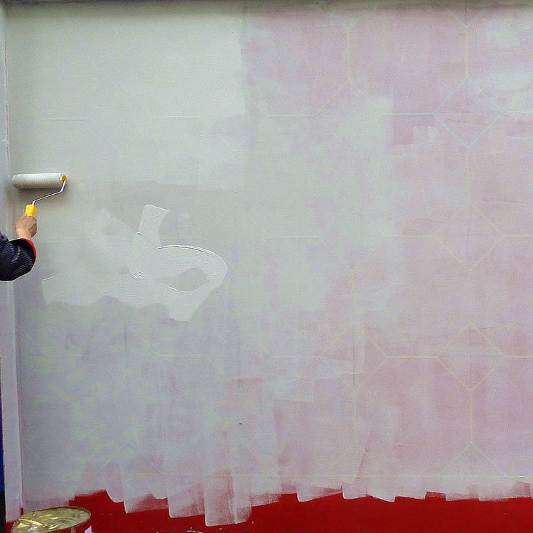 接下来就到了滚涂抗碱封闭底漆的时候了。抗碱封闭底漆具有抗碱抗盐析、加固底材、增强附着力、覆盖腻子颜色及形成分格缝颜色的作用。也就是说,它可以避免之后由于墙体碱性物质渗出所导致的水包砂表面出现泛碱或发花的问题。因此各位一定不能为了降低成本而不涂抗碱封闭底漆。