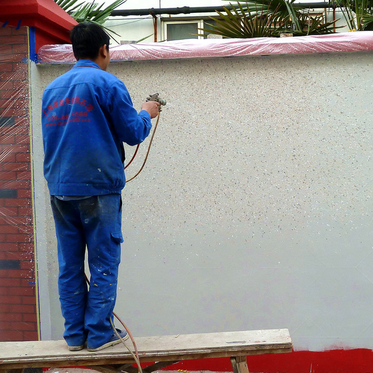 彩点一般分2次喷涂,一次表干后再喷第2次,喷涂的纹理和厚薄达到与样板效果颜色一致就可以了。