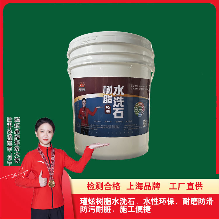 免水洗树脂乳液水洗石是以树脂乳液(如不饱和聚酯树脂、环氧树脂乳液) 为核心胶凝材料,替代传统水泥,与天然骨料(大理石粒、花岗岩粒、彩色石英砂等)按比例混合,经摊铺、压实后,依靠树脂乳液的自固化特性直接实现骨料裸露(无需水洗去除表面胶凝层),形成兼具自然颗粒质感与树脂耐候、防水特性的饰面材料。